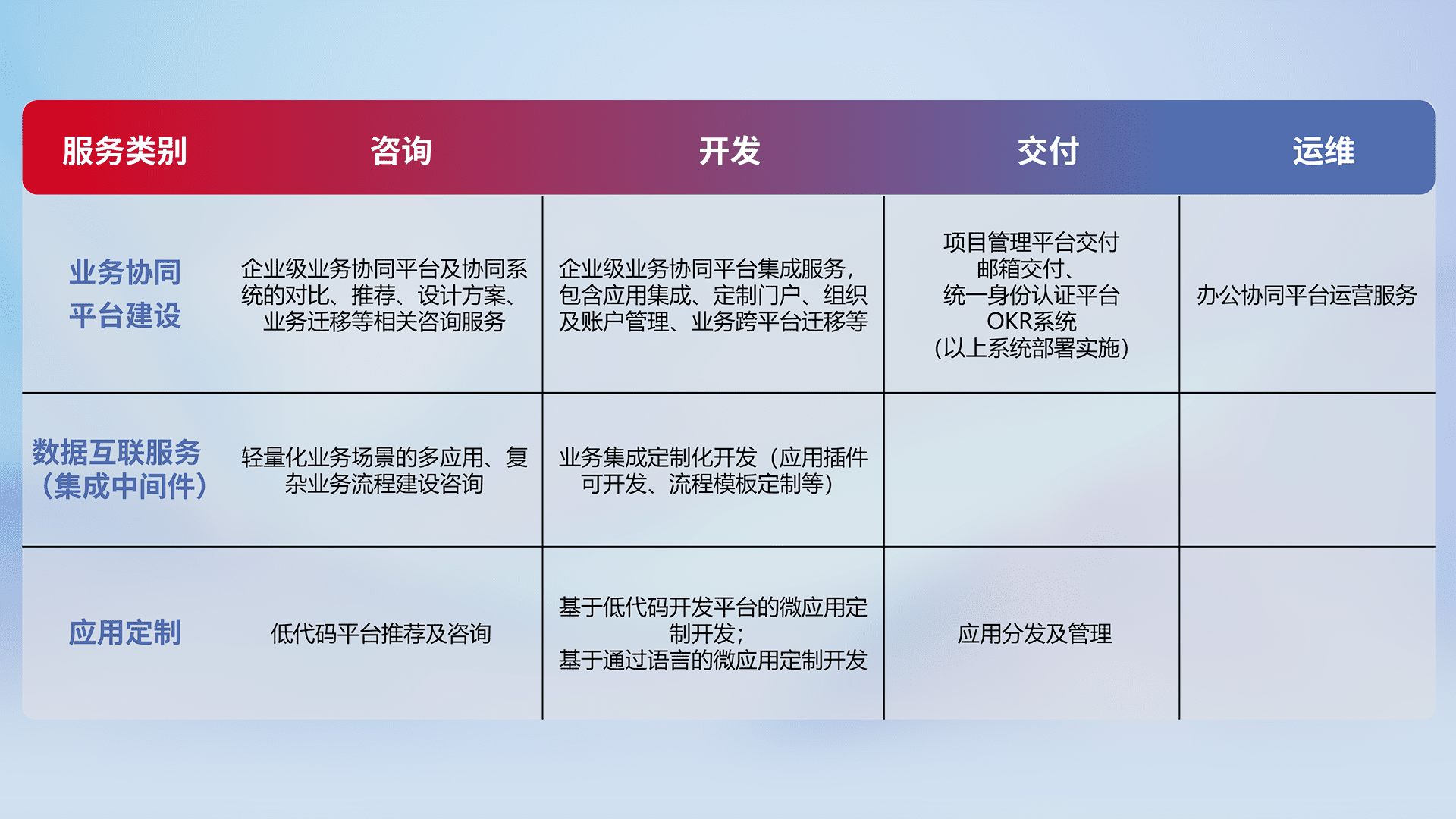 针对钉钉、、、、企微、、、、IDaas等平台级产品提供产品的规划、、、方案、、、、交付、、、、定制化开发等服务,,,实现如统一协同办公、、、、智能客户服务、、、混合会议管理、、、智能数据查询、、、等业务场景,,,实现数字化转型。。。